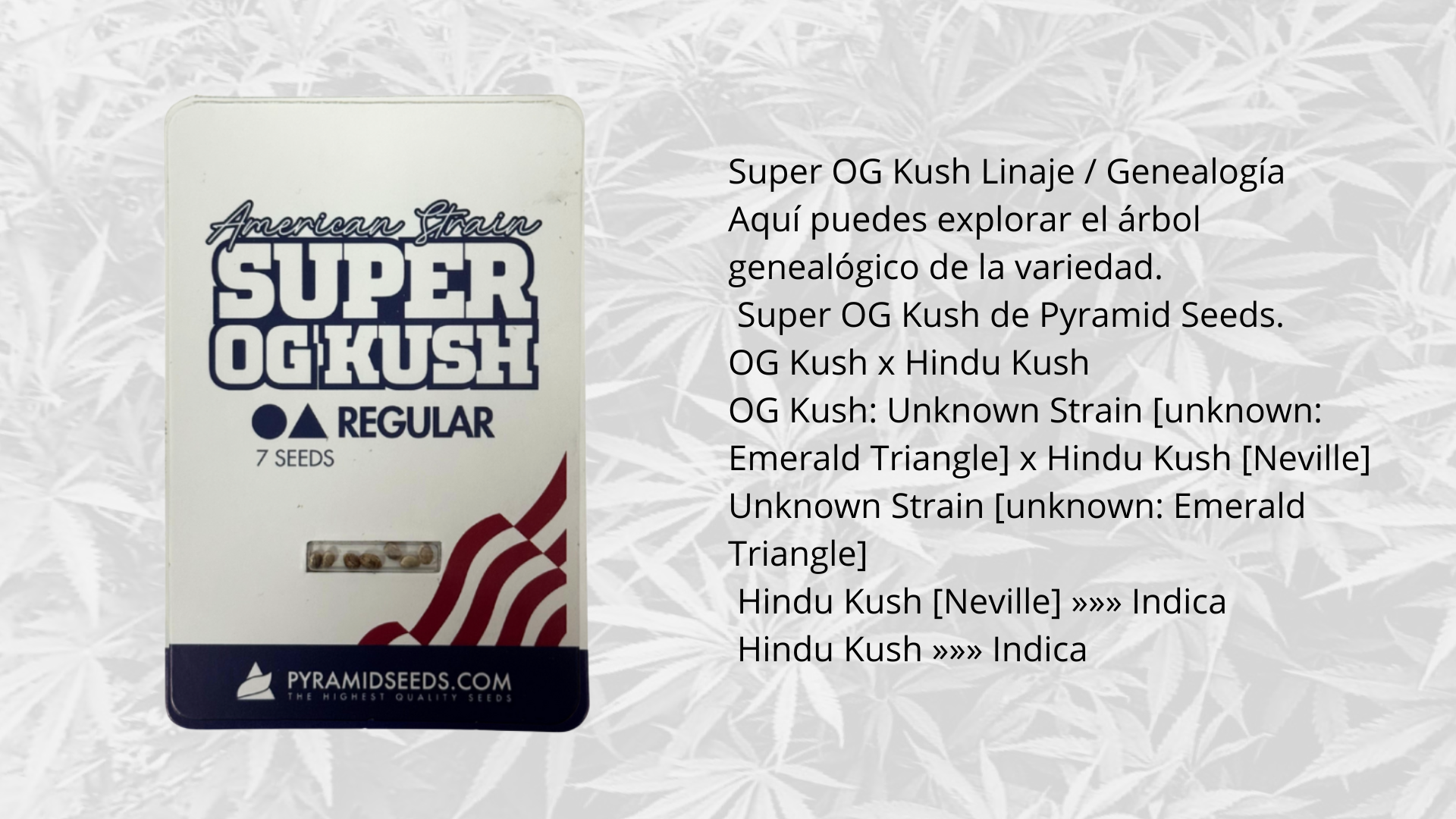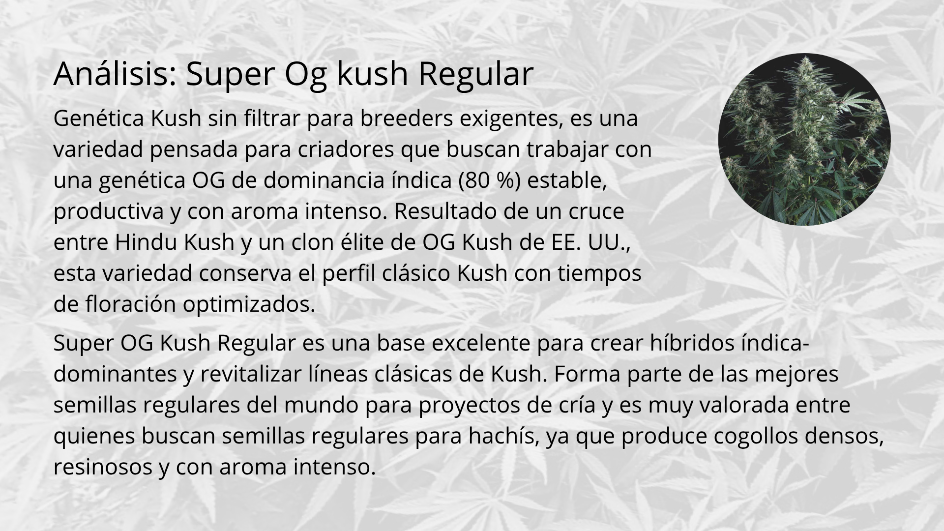 Super OG Kush (Retrocruce): No es un simple F1. Es el resultado de llevar la OG Kush un paso hacia atrás, reforzando su herencia de la Neville’s Hindu Kush. Esto da como resultado: