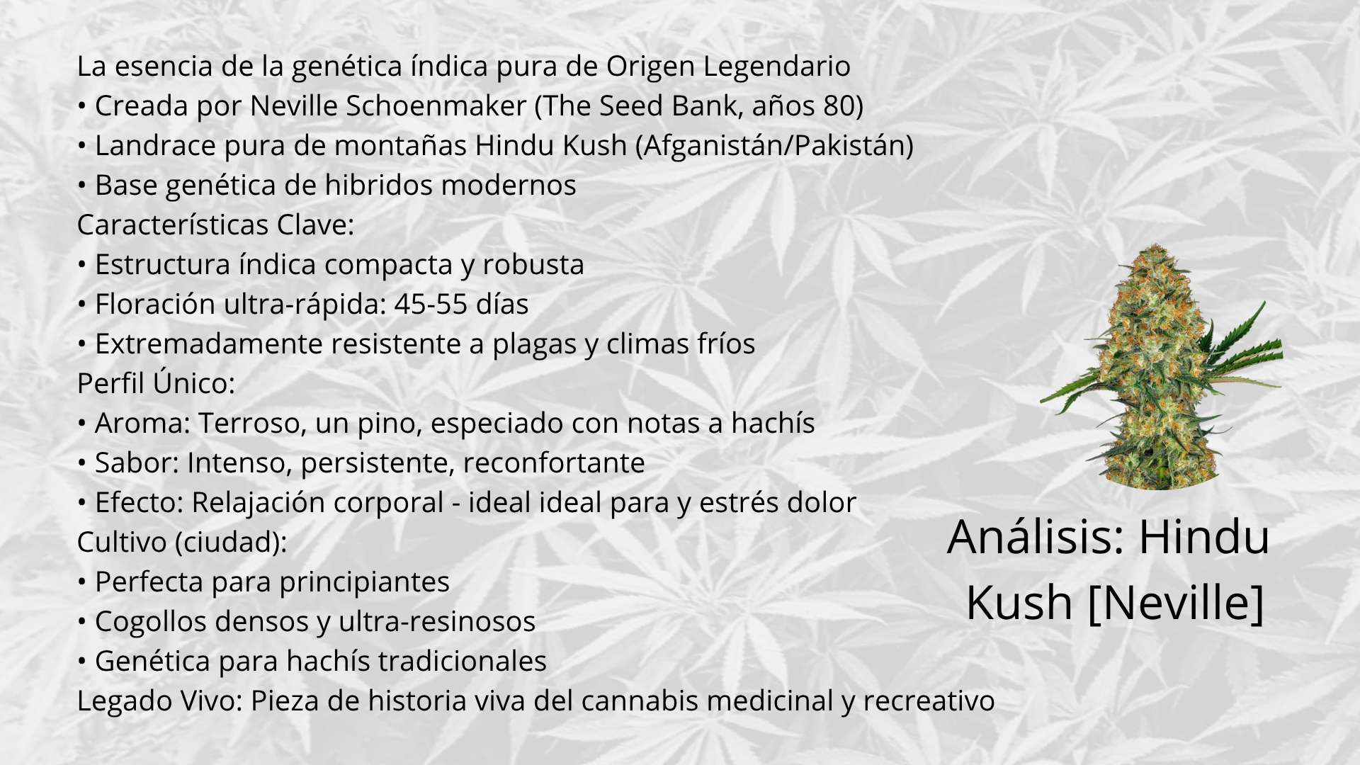 Expresión del Rasgo: Las características de la Hindu Kush (efecto corporal sedante, resinosidad, aromas terrosos y dulces, estructura compacta) se vuelven mucho más dominantes y consistentes.