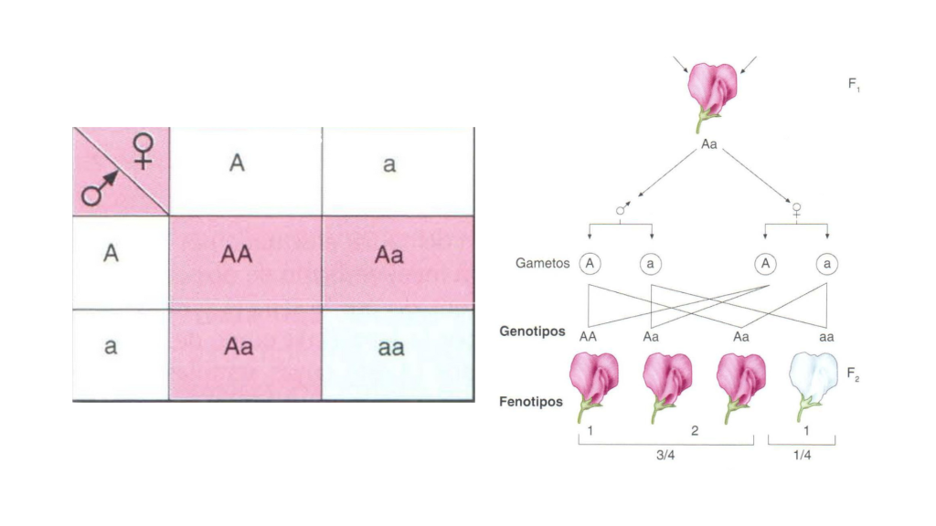 En la F2 se produce la segregación de tres partes para el carácter dominante y de una parte para el carácter recesivo.