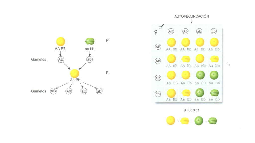 Principio de la Transmisión Independiente de los caracteres hereditarios en la segregación de la autopolinización de un híbrido F2.