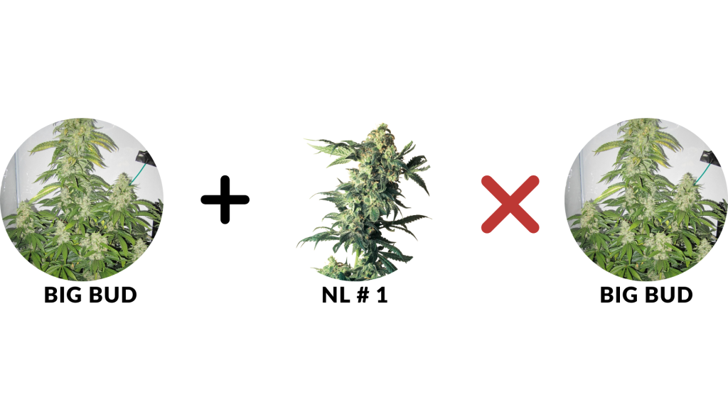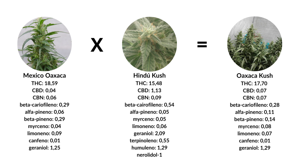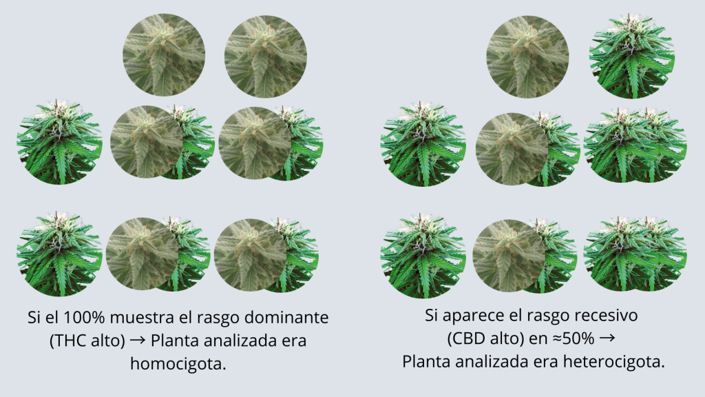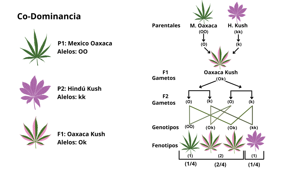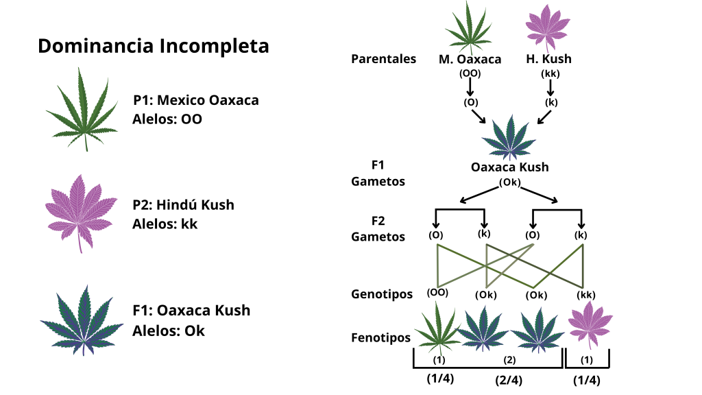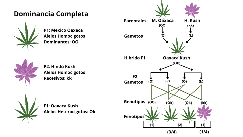 «Si cruzas la variedad Oaxaca (hojas verdes) con Hindú Kush (hojas moradas), el verde es dominante sobre morado, toda su descendencia tendrá hojas verdes. El morado no se ve, pero sigue oculto en sus genes.»